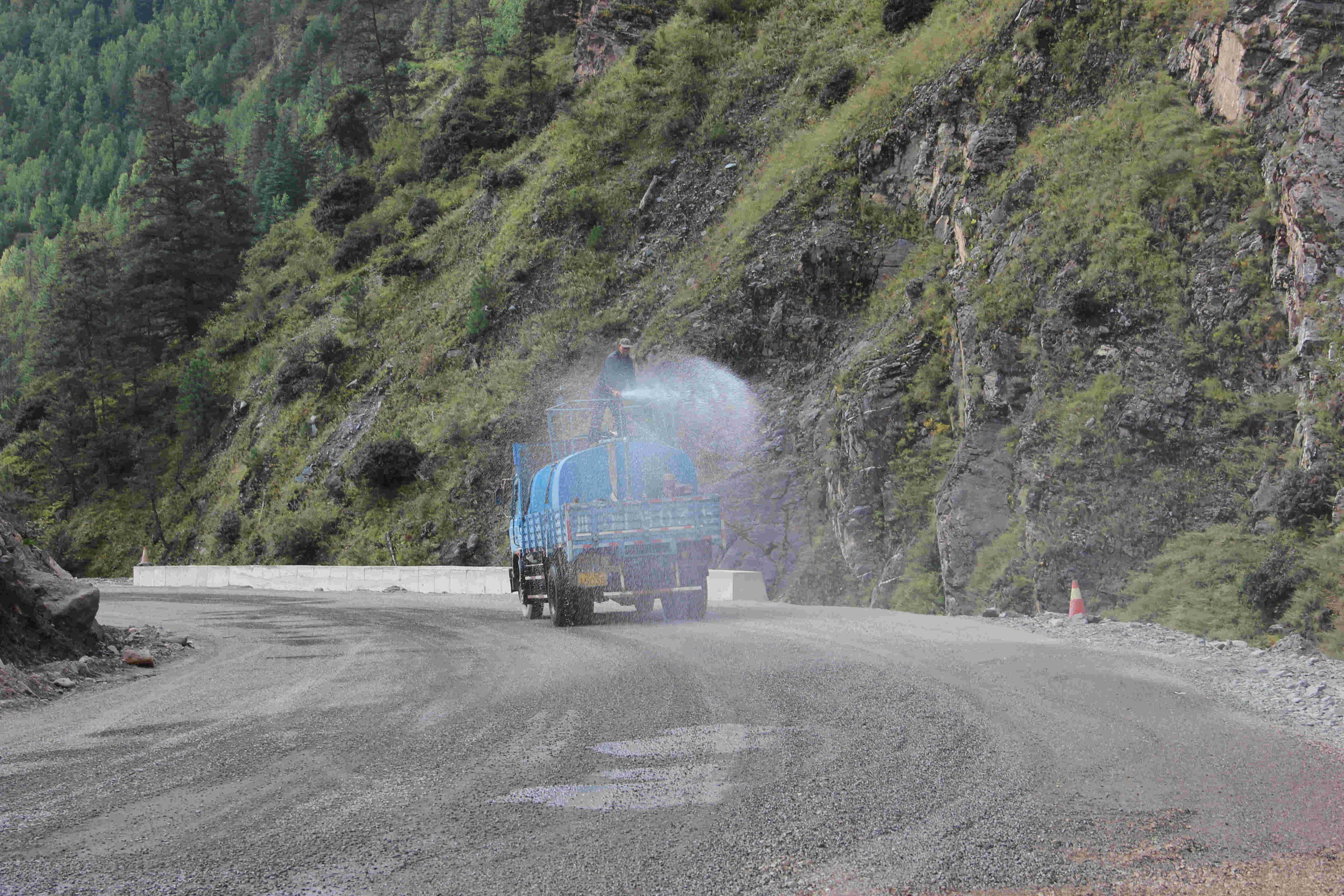 为完成机场通航任务,确保省委工作组、州委州政府各级领导及媒体记者团能安全舒适的通过理亚路沿线,理亚路指挥部对全线保通工作进行了详细的部署安排,制定了相应的保通方案和措施,为亚丁机场精彩亮相保驾护航:一是对沿线K225段边坡松动滑坡点进行及时处置,预留出缓冲避险区,设置安全警示标识,安排保通人员驻守,并于9月15日消除了该段的安全隐患;二是对沿线已半幅铺设沥青混凝土下面层段的接头处进行了平稳过渡处置,保证车辆顺畅通行;三是在9月16日当天安排洒水车、灌车对铺设级配碎石垫层段落进行定点定时分段洒水降尘,保证路面湿润度,并在沿线有回头弯等行车视线较差路段安排保通人员进行引导,所有保通人员佩戴对讲机,保证及时沟通,消除了扬尘所带来的行车安全隐患。