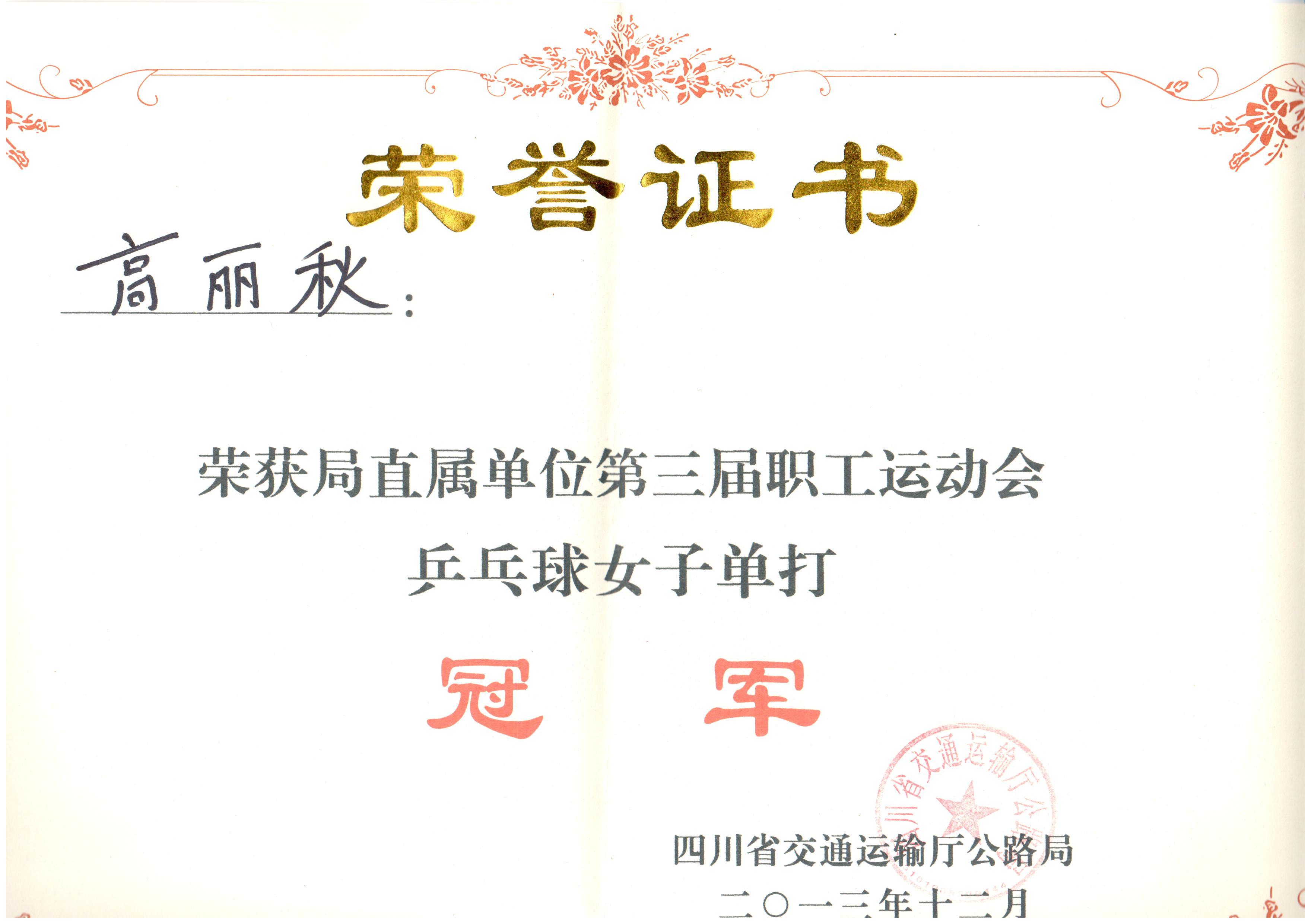 12月28日,在局直属单位第三届职工运动会比赛中,公司参赛员工展现了奋勇争先、斗志昂扬的拼搏精神,最终高丽秋获得乒乓球女子单打冠军的佳绩。