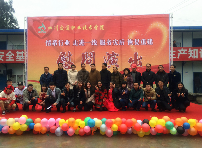 1月8日,四川交通职业技术学院全体师生员工为表达对芦山地震灾区灾后恢复重建项目的关注和支持,对长期奋战在灾后恢复重建战场上的参建职工的关心和崇敬,丰富和活跃春节期间广大建设者的文化生活,特地组建了慰问演出文艺小分队,来到兴蜀公司雅安国道351线、318线的灾后恢复重建现场进行“情系行业、走进一线、服务灾后恢复重建”慰问演出,受到一线参建者们的热烈欢迎。