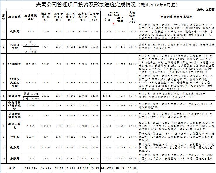 兴蜀公司管理项目投资及形象进度完成情况(截止2016年8月底)