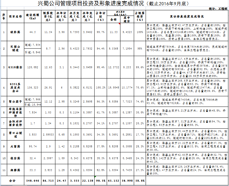 兴蜀公司管理项目投资及形象进度完成情况(截止2016年9月底)