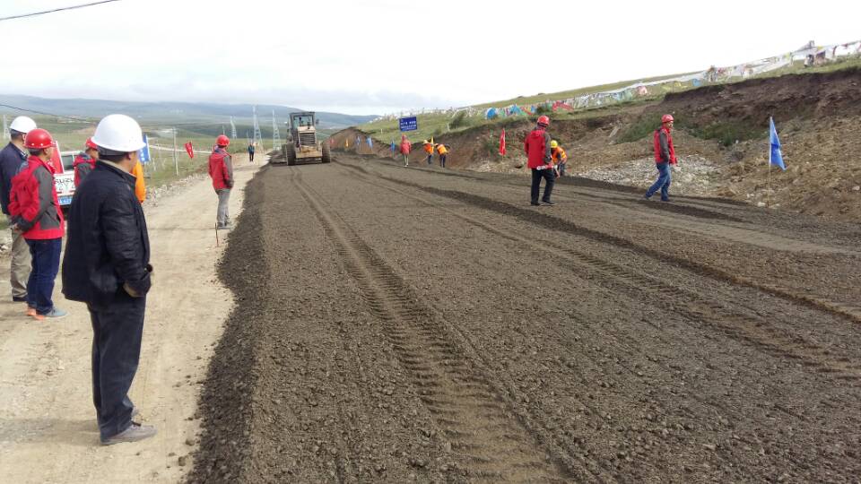 本次铺筑路段选定在B合同段K101+460~K101+160段,全幅300米,施工工艺采用级配混合料集中拌合,平地机摊铺、压路机碾压的方式进行,施工时间约3个半小时。兴蜀公司色达项目指挥部高度重视此次试验段铺筑工作,铺筑前进行了沟通协调,明确了职责分工,完善了机械设备配备、施工方案等。经现现场对铺筑高程、压实度、横坡等技术检测后,各项指标均达到设计要求。