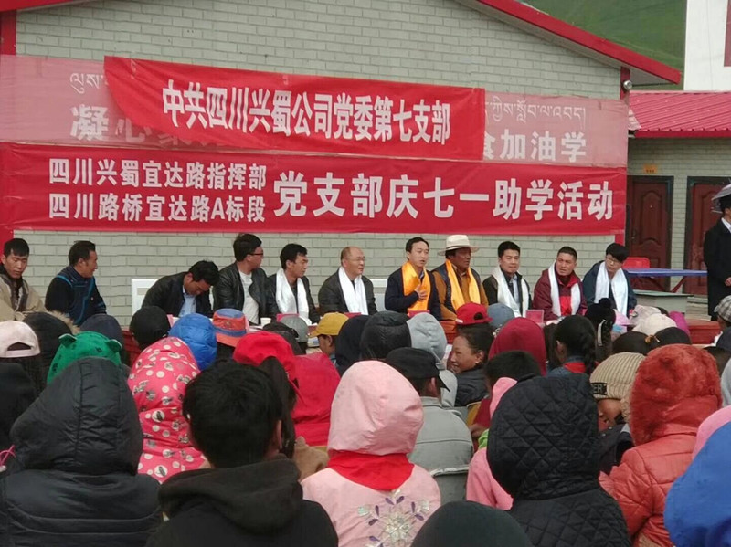 在中国共产党建党97周年之际,2018年6月29日,兴蜀公司第七党支部、四川路桥宜达路党支部、镇江路桥宜达路党支部到石渠县阿日扎镇中心校开展庆“七一”爱心助学活动,为镇中心校、麻曲村小捐赠了助学资金5000元和价值2万元的书包、文具、篮球等文体用品。兴蜀公司副总经理潘华同志表达了对全体小朋友的殷切希望和对全体教职工的谢意,勉励小朋友好好学习、天天向上,将来回报社会、报效祖国。镇党委书记降拥代表镇政府、镇中心校和麻曲村小全体师生向兴蜀公司和路桥公司表达了最真诚的谢意,感谢他们对阿日扎公路建设和牧区教育的无私奉献。