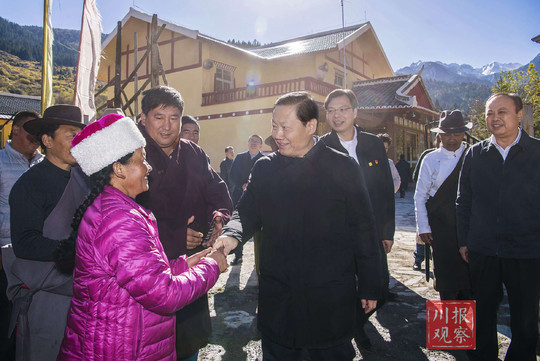 2018年10月31日,省委书记彭清华到九寨沟县漳扎镇中查村调研,亲切看望受灾群众,了解地震受损农房维修加固、旅游业恢复、就业务工、