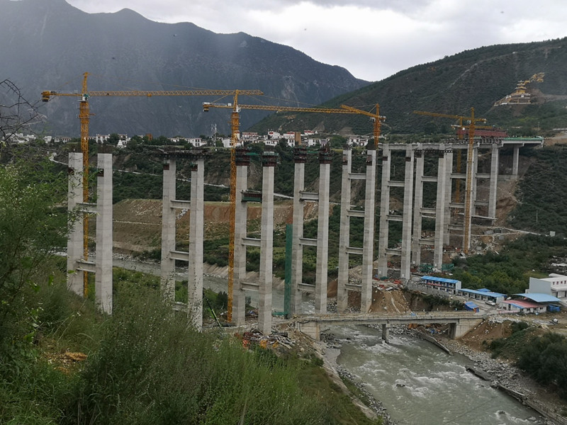 考虑到大桥高空作业难度较大,最高墩柱有81米,9个墩柱为双柱式空心薄壁桥墩,桑然部指挥部布置了5台40米到91米高的塔吊,每台塔吊“分管”1至2个墩柱,先将施工材料运至墩柱下面,采用塔吊吊装至墩柱面,待墩柱施工完成后,施工盖梁和架设预制梁便开始了。塔吊最“忙碌”的时候,多至9个墩柱同时作业,大大提升了墩柱的施工效率。