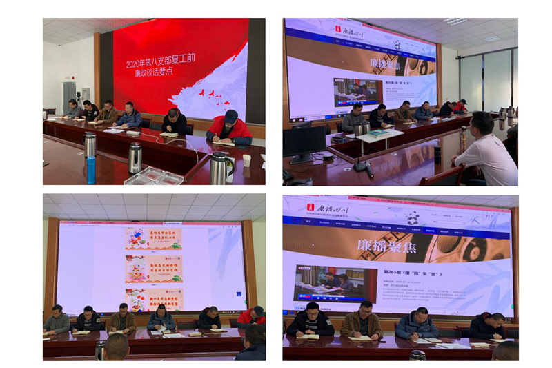 3月25日,公司第八党支部组织川九路、九若路、漳大路指挥部全体人员召开2020年复工廉政建设专题会议,进行复工前廉政谈话,会议由支部书记潘嵩同志主持。副书记刘建茂同志传达公司廉政文件要求,参会人员共同学习了廉政建设相关视频资料。会议要求各指挥部完善廉政风险防控体系,细化落实主体责任,各管理人员要加强自我约束,始终保持廉洁自律、脚踏实地的工作作风,认真履行“一岗双责”。谈话人员分别结合自身实际,对如何履行岗位职责,做好廉洁工程做了表态发言。最后,项目指挥长分别与各管理人员签订廉政建设目标责任书。