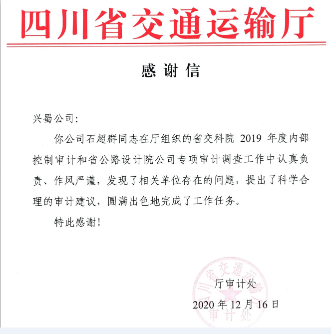 兴蜀公司财务部石超群同志圆满完成厅审计处安排的审计工作