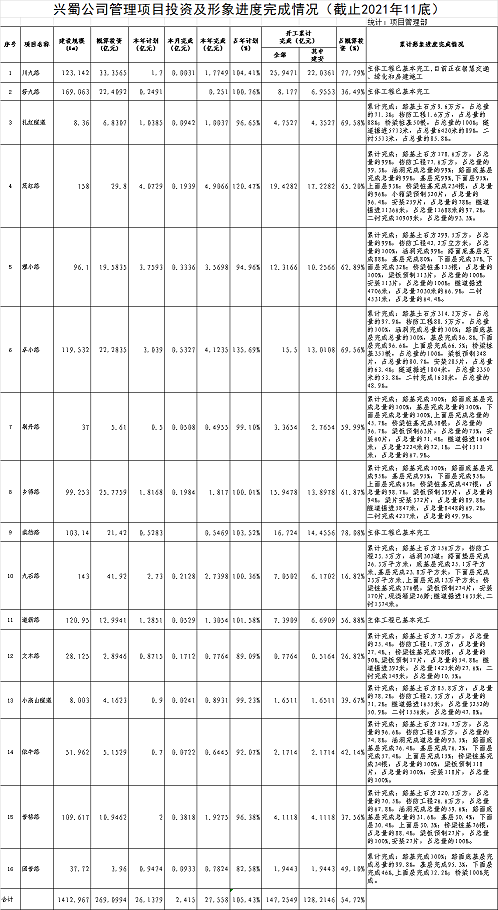 兴蜀公司管理项目投资及形象进度完成情况(截止2021年11底)