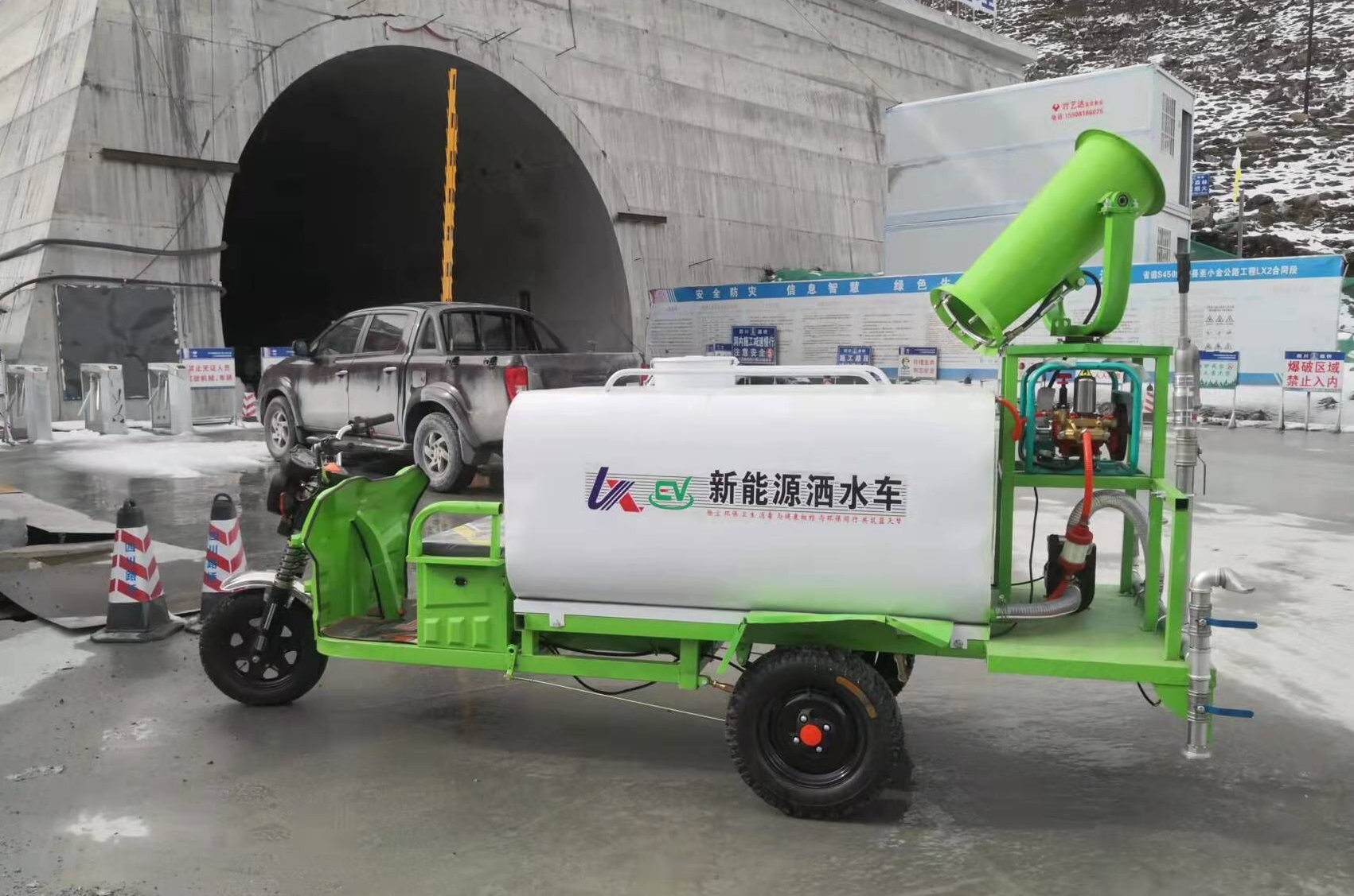 为进一步加强环境保护工作,贯彻绿色环保理念,理小路项目采购引进了一批“新能源洒水车”。该洒水车体型较小,适用于多种场地,配备了前冲、侧喷、后洒和高位雾炮等。采用高压水泵和特殊喷嘴将水形成直径为10-200um的水雾,通过远射风机将粉尘送到水雾集中处,水雾与粉尘结合,吸附成团下沉到地面,达到有效降尘的目的。新型能源洒水车采用电动驱动的方式,减少了二氧化碳的排放,有效除尘率可达98%。对大气防污、节能减排有明显作用,有效的保护了作业人员的身体健康。