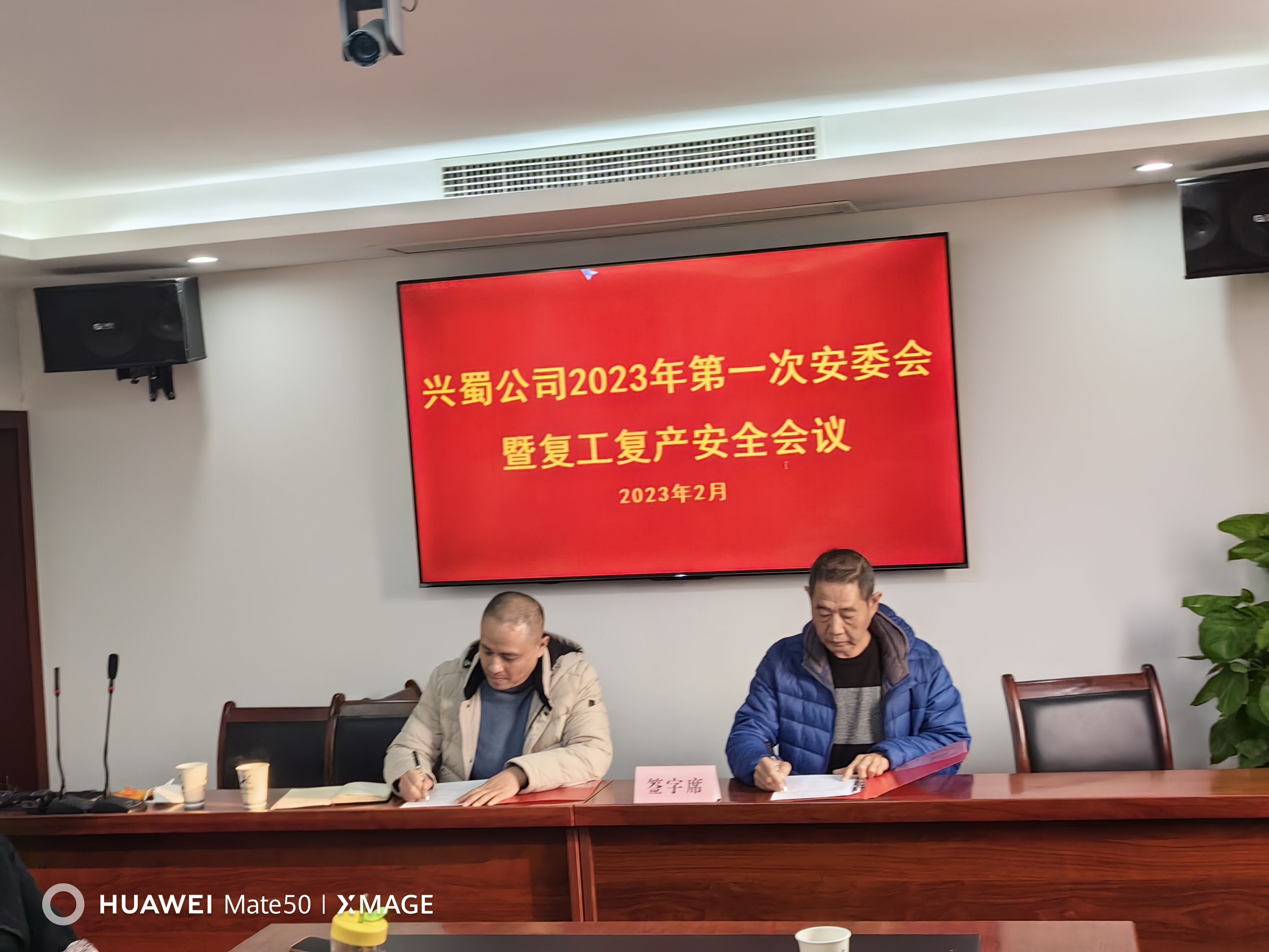 2月3日,兴蜀公司召开2023年第一次安委会暨复工复产安全会议。参会人员观看了四川省公路水路行业安全生产典型事故警示录,传达学习厅工作要求及局安委办《第一次全体成员(扩大)会议》,公司董事长与项目分管领导签订2023年安全目标责任书。安委会主任、董事长袁泉要求:一是进一步提高认识,提高责任感和紧迫感;二是扎实推动项目高质量复工复产;三是用严、细、深、实的标准,做好每项工作;四是持之以恒抓好项目安全生产;五是严格落实森林草原防灭火工作。安委会常务副主任、总经理潘华要求:系统谋划项目复工复产,进一步落实安全监管责任;严格复工程序,复工安全生产条件不达标坚决不予复工;加大应急管理力度,从严查处安全生产中的违法行为。公司安委会全体成员、职能部门负责人和项目指挥部负责人、安全工程师参会。