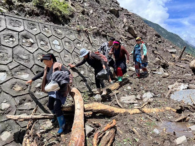 2023年7月7日凌晨,国道549线九石路TJ2-B标,TJ3标项目所在地九龙县雪洼龙镇,遭遇强降雨,暴雨中夹杂着冰雹,导致道路沿线突发大面积山体滑坡,并伴随泥石流。三处边坡垮塌,四处冲沟滑坡及泥石流塌方约50000m3对部分房屋冲毁,河道形成挤压,路基和县、乡、村道多处损毁严重,导致麻窝和雪洼两村1000余人被困、民房损毁、通讯中断。