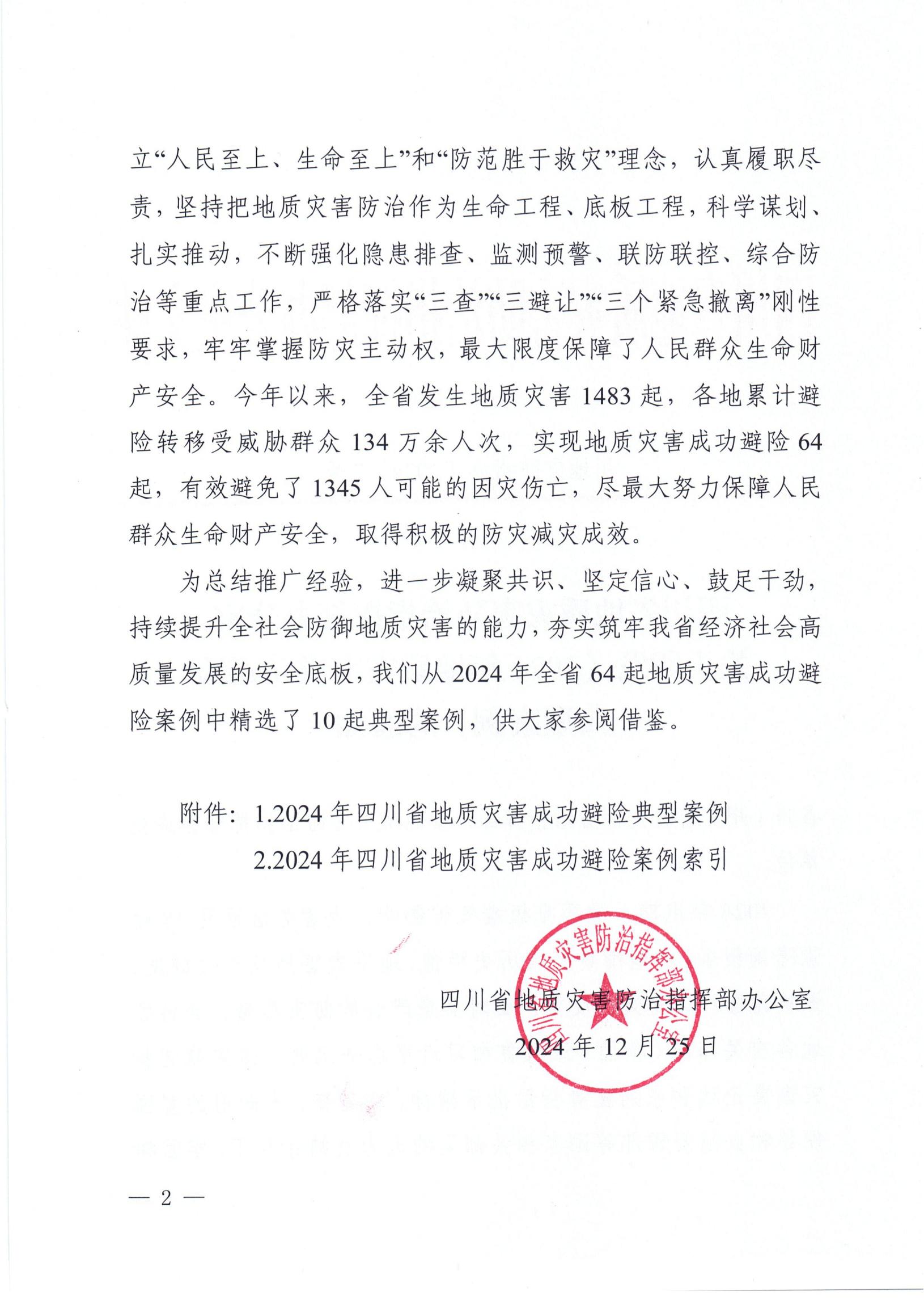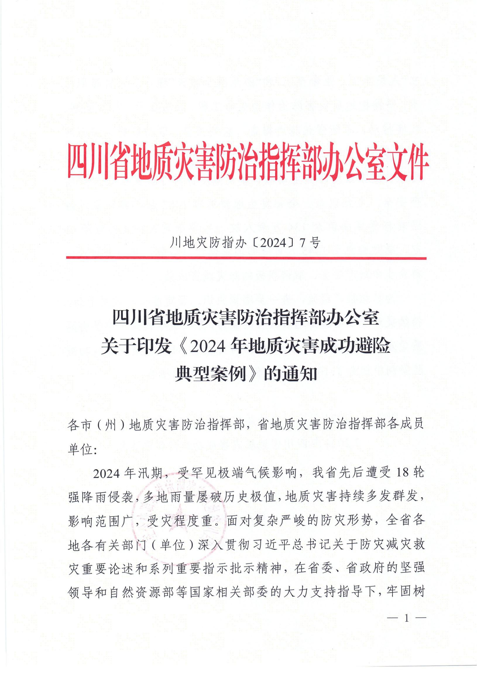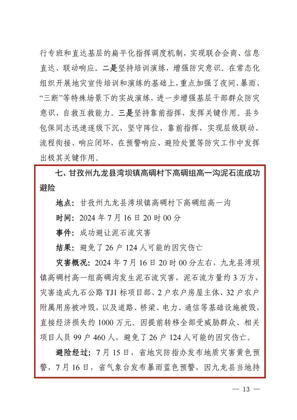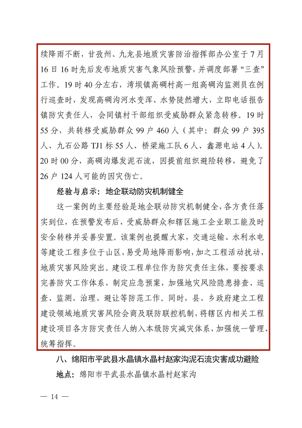 这一案例的主要经验是地企联动防灾机制健全,各方责任落实到位,在预警发布后,受威胁群众和辖区施工企业职工能及时安全转移并妥善安置。该成功避险经验入选四川省地质灾害防治指挥部《关于印发2024年地质灾害成功避险典型案例》的通知(川地灾防指办[2024]7号)。