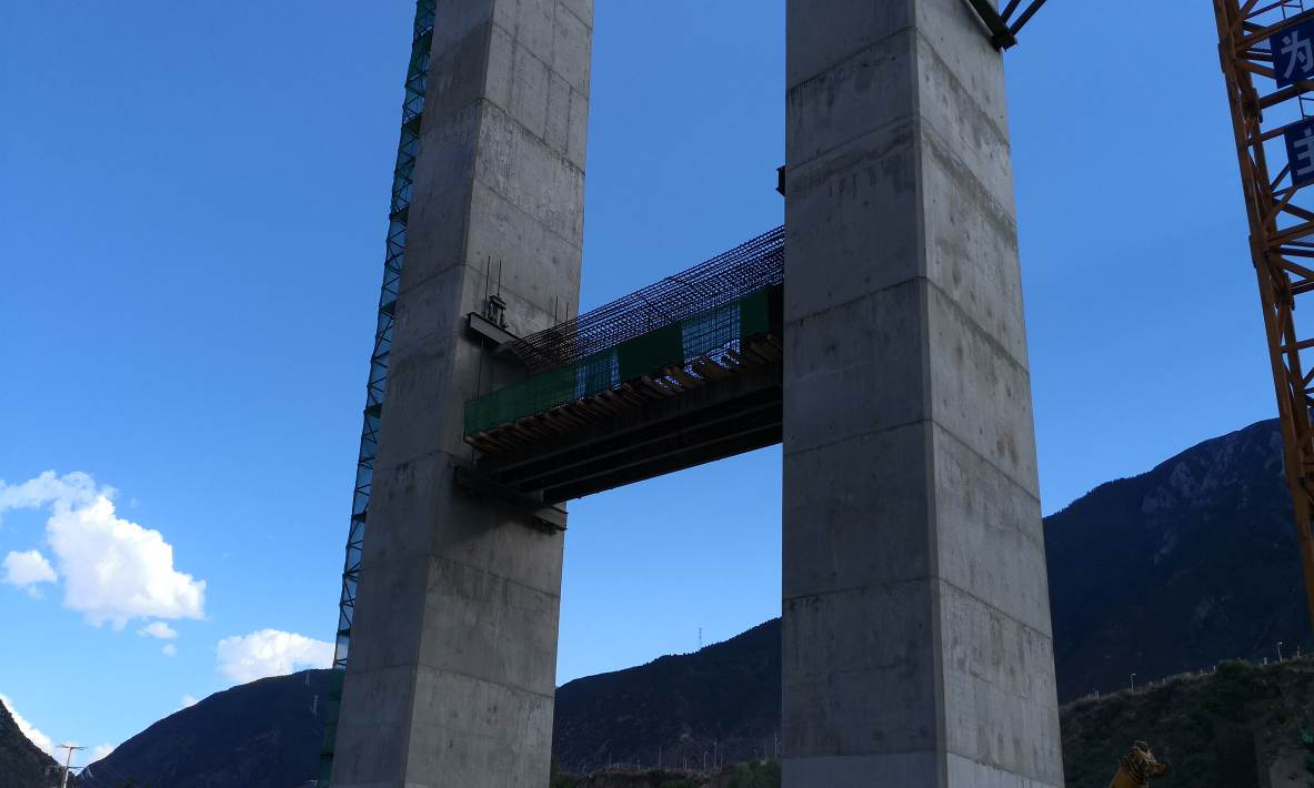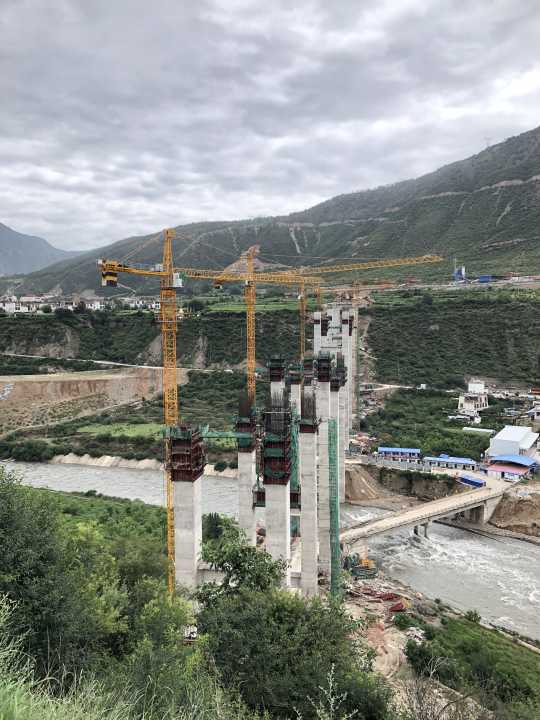 考虑到大桥高空作业难度较大,最高墩柱有81米,9个墩柱为双柱式空心薄壁桥墩,桑然部指挥部布置了5台40米到91米高的塔吊,每台塔吊“分管”1至2个墩柱,先将施工材料运至墩柱下面,采用塔吊吊装至墩柱面,待墩柱施工完成后,施工盖梁和架设预制梁便开始了。塔吊最“忙碌”的时候,多至9个墩柱同时作业,大大提升了墩柱的施工效率。