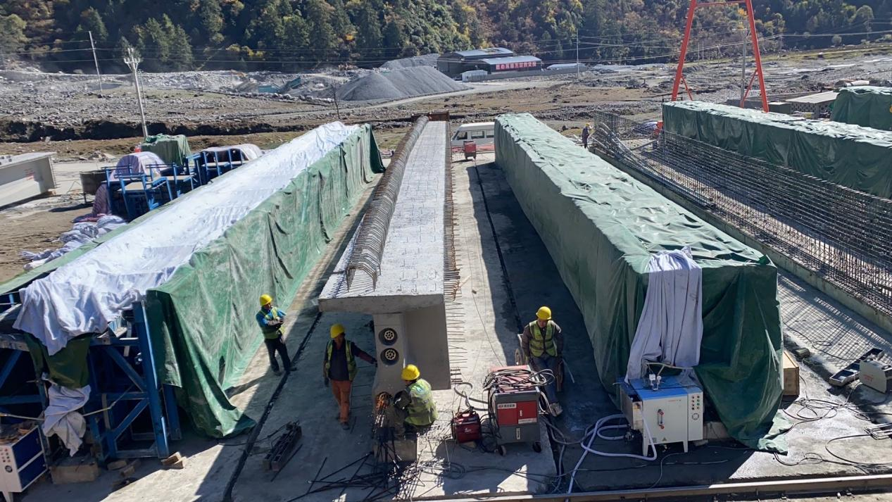 进入冬季后,兴蜀公司代建管理的国道549线九石路指挥部根据项目实际情况,合理部署冬季施工方案,全力推动工程建设进度。一是对冬季施工中混凝土外加剂如减水剂、防冻剂进行现场查验,确保质量;二是对砂石料提前进行覆盖保温,避免温度过低影响混凝土拌和质量;三是对水进行加热,检测当日混凝土出盘温度,同时提高混凝土的浇筑速度,做好入模温度控制;四是对预制梁重点采用蒸汽恒温养护、搭设暖棚、棉被及时包裹覆盖,加强混凝土保温、测温、养护工作。通过加强与气象、水利、自然资源等部门的信息沟通,及时掌握并传递灾害性天气预报预警信息,多措并举,确保冬季施工质量,稳步推进项目建设。