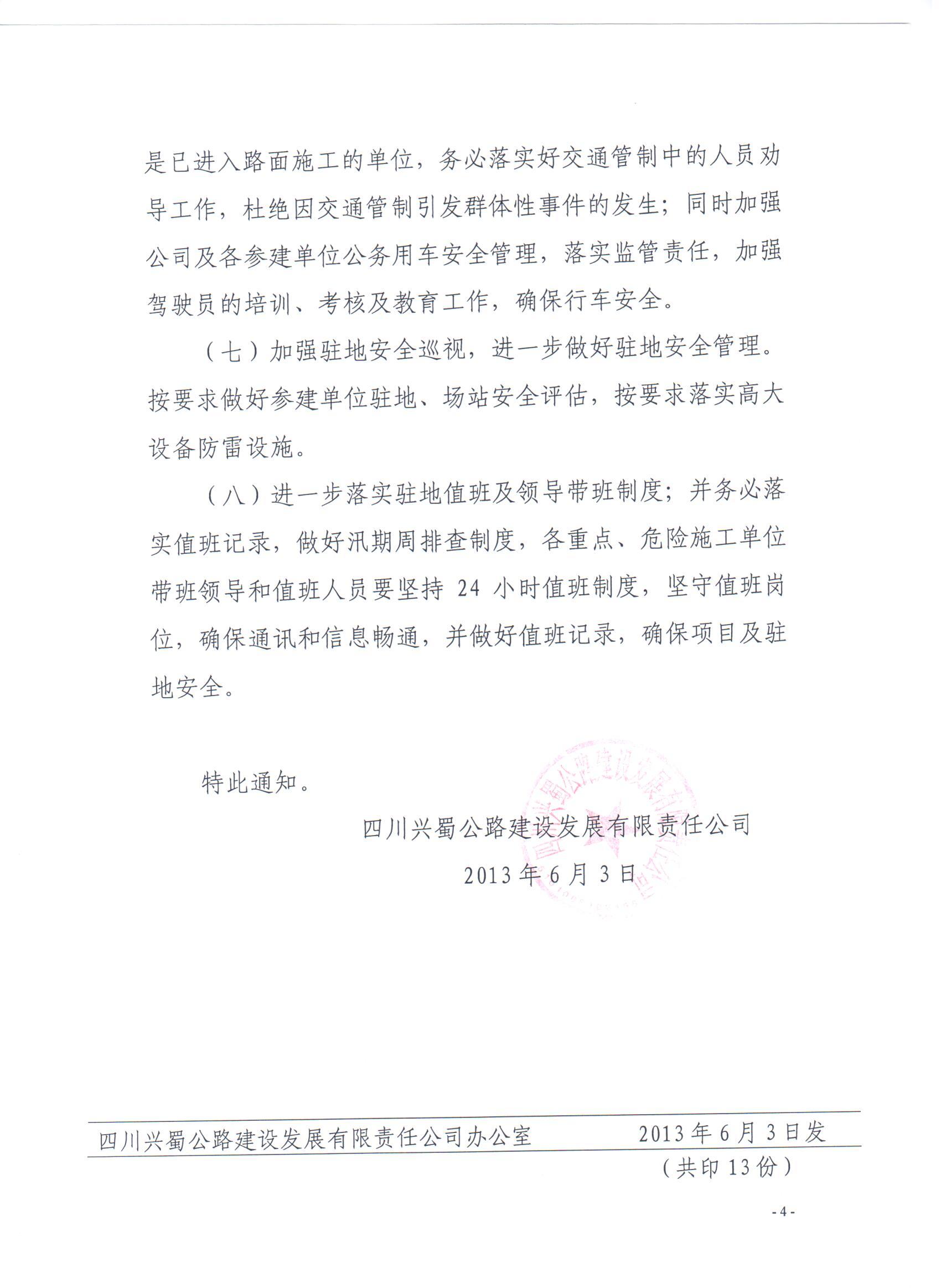 (六)加强交通安全管理,确保道路畅通及行车安全。进一步加强施工路段交通疏导,做好保通、保畅工作。特别是已进入路面施工的单位,务必落实好交通管制中的人员劝导工作,杜绝因交通管制引发群体性事件的发生;同时加强公司及各参建单位公务用车安全管理,落实监管责任,加强驾驶员的培训、考核及教育工作,确保行车安全。