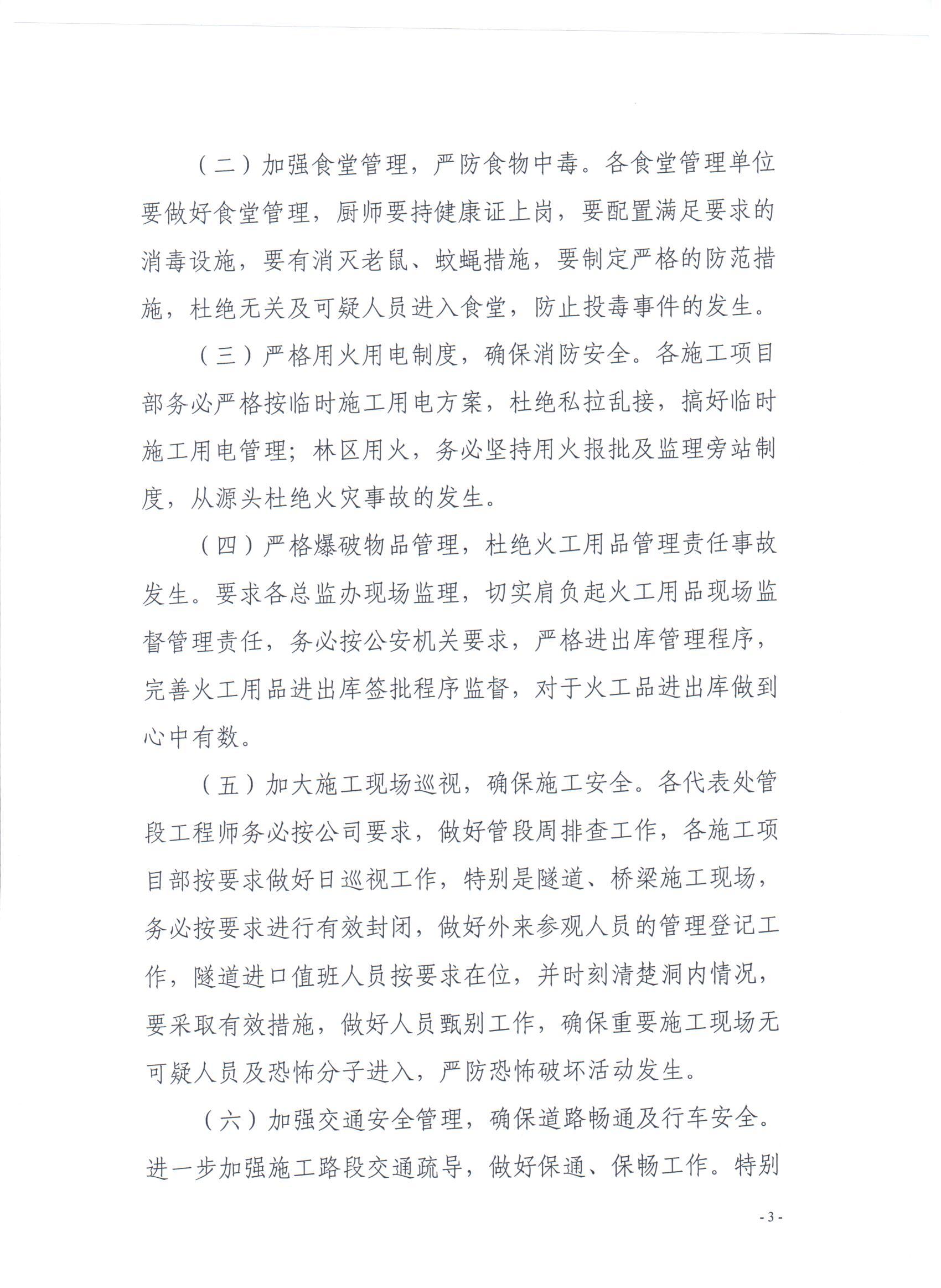(五)加大施工现场巡视,确保施工安全。各代表处管段工程师务必按公司要求,做好管段周排查工作,各施工项目部按要求做好日巡视工作,特别是隧道、桥梁施工现场,务必按要求进行有效封闭,做好外来参观人员的管理登记工作,隧道进口值班人员按要求在位,并时刻清楚洞内情况,要采取有效措施,做好人员甄别工作,确保重要施工现场无可疑人员及恐怖分子进入,严防恐怖破坏活动发生。