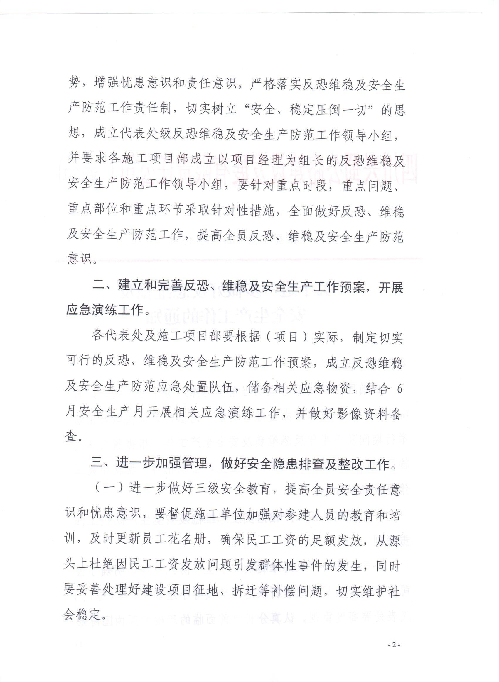 公司高度重视反恐维稳及安全生产防范工作,明确了公司安全生产领导小组履行反恐维稳领导小组职责,各(部门)代表处要高度重视,认真分析目前面临的严峻的国内国际形势,增强忧患意识和责任意识,严格落实反恐维稳及安全生产防范工作责任制,切实树立“安全、稳定压倒一切”的思想,成立代表处级反恐维稳及安全生产防范工作领导小组,并要求各施工项目部成立以项目经理为组长的反恐维稳及安全生产防范工作领导小组,要针对重点时段,重点问题、重点部位和重点环节采取针对性措施,全面做好反恐、维稳及安全生产防范工作,提高全员反恐、维稳及安全生产防范意识。