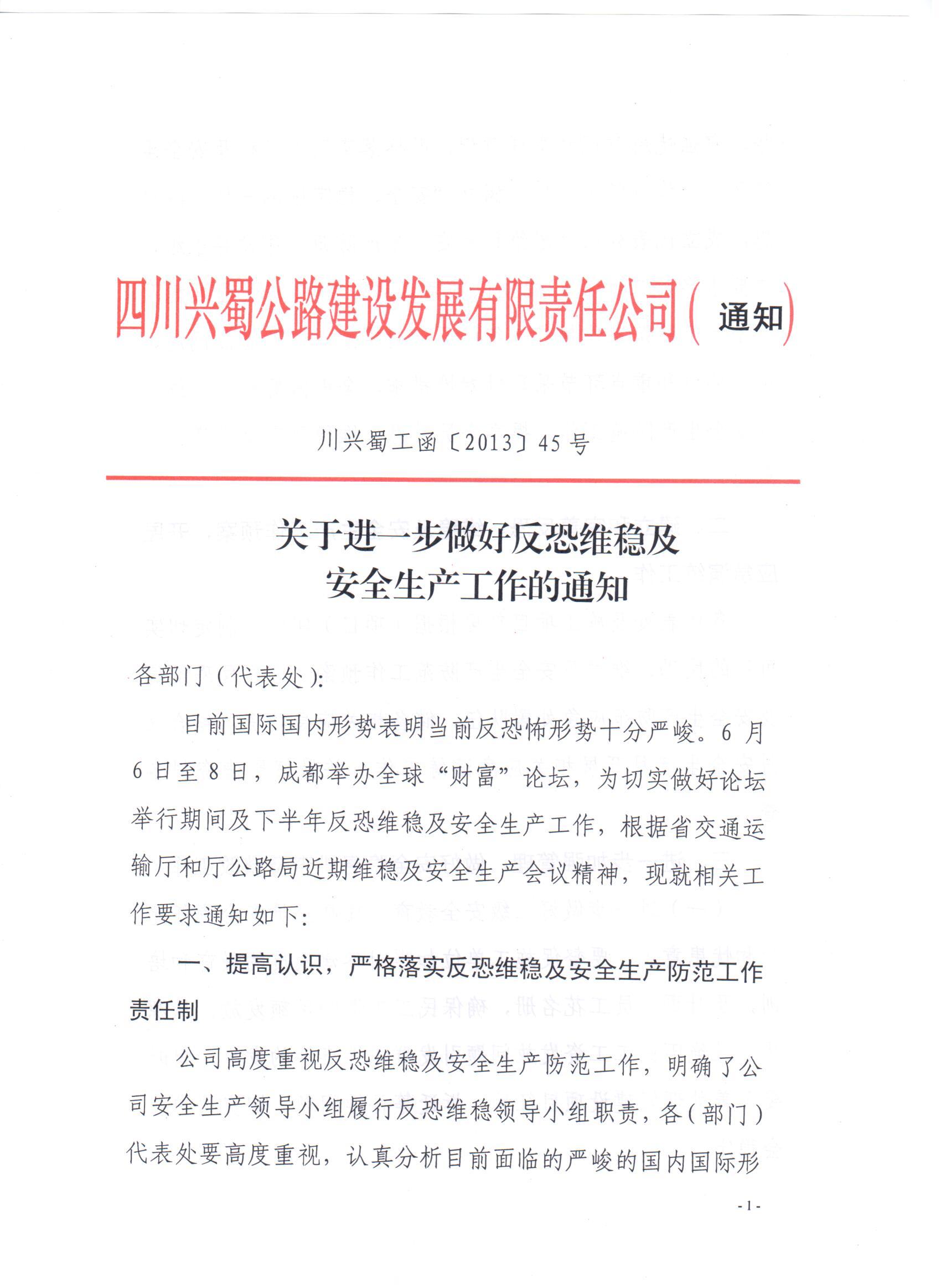 目前国际国内形势表明当前反恐怖形势十分严峻。6月6日至8日,成都举办全球“财富”论坛,为切实做好论坛举行期间及下半年反恐维稳及安全生产工作,根据省交通运输厅和厅公路局近期维稳及安全生产会议精神,现就相关工作要求通知如下: