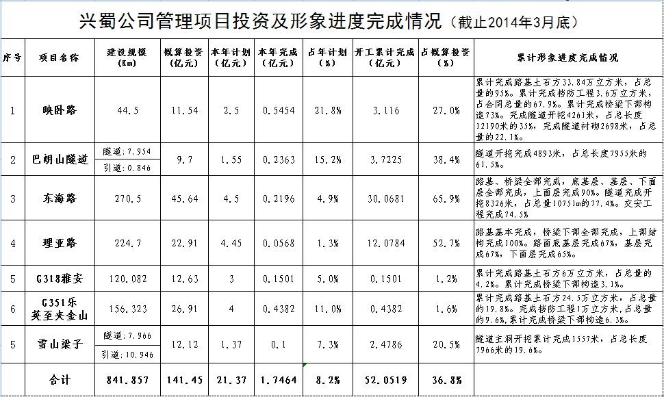 公司管理项目投资及形象进度完成情况(截止2014年3月底)