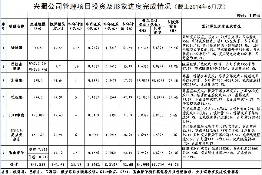 公司管理项目投资及形象进度完成情况(截至2014年6月底)