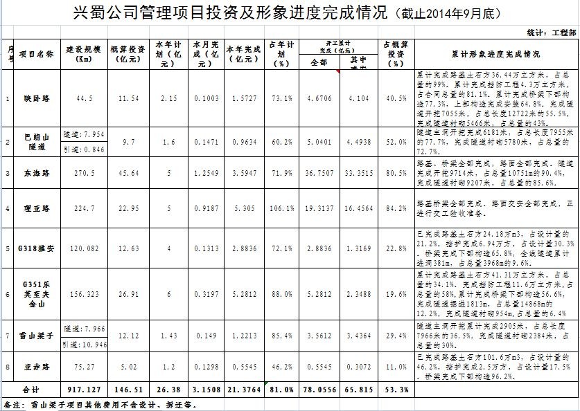 公司管理项目投资及形象进度完成情况(截止2014年9月底)