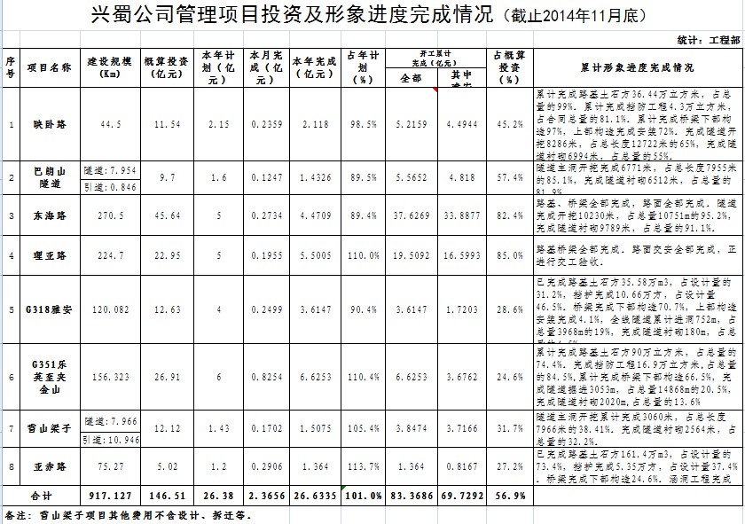 公司管理项目投资及形象进度完成情况(截止2014年11月底)