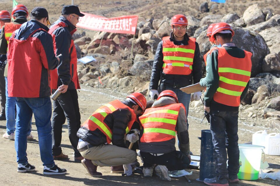 本次试验段全长200米,路基设计宽度7.5米,最高填方3米,最低填方1.81米,采用具有代表性的砂砾土作为填料,按网格上料挂线摊铺碾压。为确保一次性铺筑成功,兴蜀公司海磨路、俄安路建设指挥部要求前期相关单位完成对路基填料的标准击实试验和CBR值测定,进一步完善施工管理组织机构、配备机械设备,报批相关实施方案。