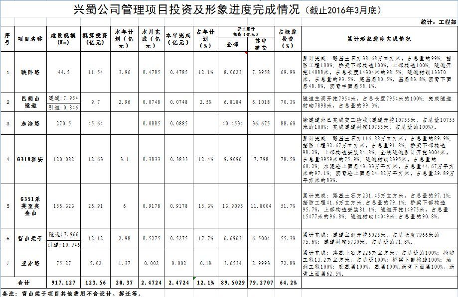 兴蜀公司管理项目投资及形象进度完成情况(截止2016年3月底)