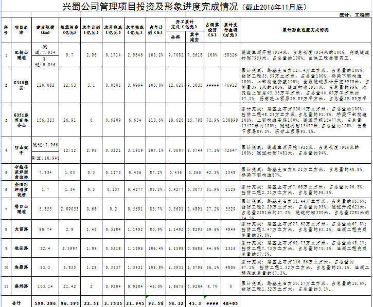兴蜀公司管理项目投资及形象进度完成情况(截止2016年11月底)