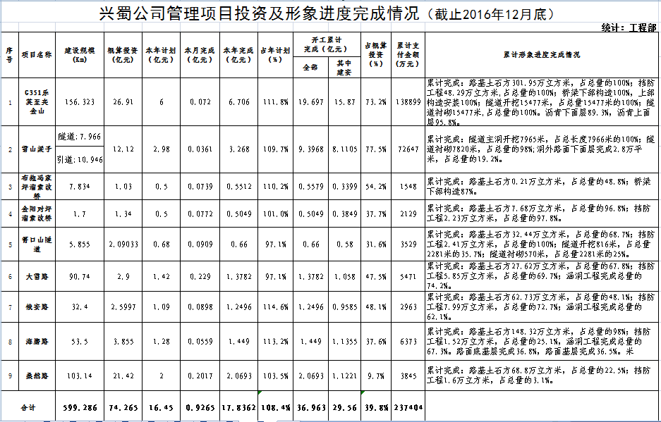 兴蜀公司管理项目投资及形象进度完成情况(截止2016年12月底)