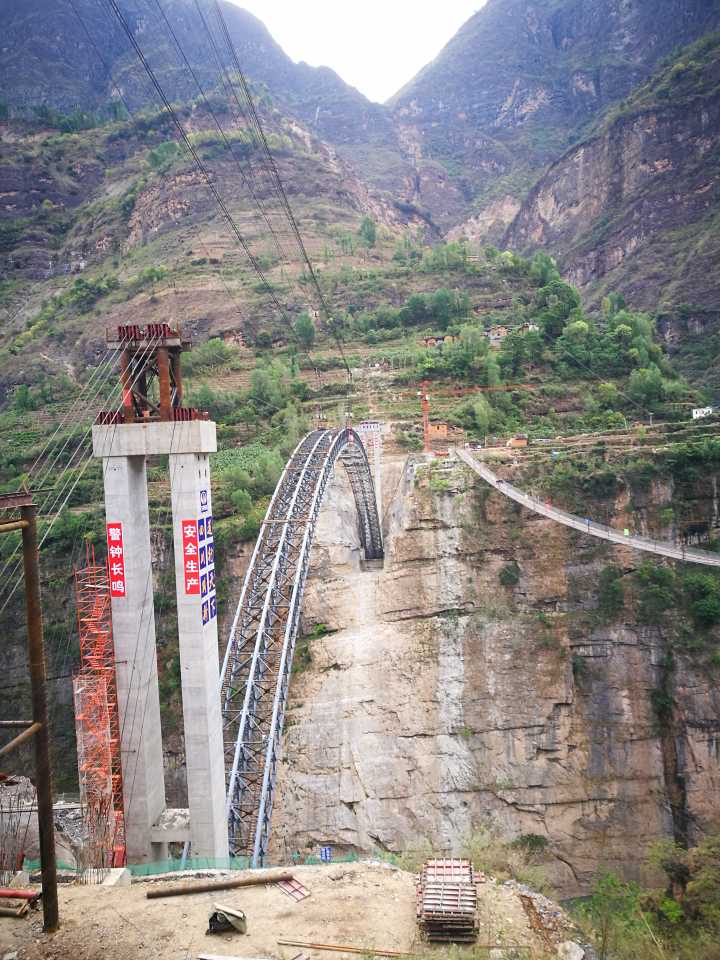 凉山布拖县冯家坪境内的溜索改桥是连接云南巧家县鹦哥村的必经之路,桥梁横跨金沙江大峡谷,大桥全长385米,主跨为260米钢管砼拱桥,桥面距离水面近230米,施工难度和安全风险极高。自2015年11月开工以来,兴蜀公司凉山溜索改桥指挥部带领参建单位团结一心、迎难而上,攻克大体积拱座基坑开挖岩体破碎、大型钢结构加工成型场地狭窄、管拱空中吊装合拢精度及线性控制难、大型缆索吊装施工难度大等多项技术难题,采用无支架斜拉扣挂施工技术,自行设计加工缆索吊装系统,精确管控吊装过程,最终实现大桥主拱合拢,为大桥顺利建成奠定了基础。