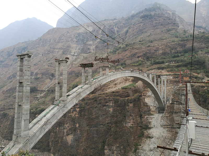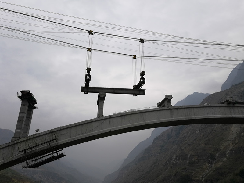 布拖冯家坪金沙江溜索改桥项目坐落在“亚洲第一高溜”鹦哥溜索下游500米的金沙江上,距金沙江水平面276米,桥梁基础两岸山体坡角为70~80°,地势十分险要。加之峡谷季风性气候,风力时常达到七八级,使箱梁吊装要同时经受住高空、大风的多重考验。为确保箱梁工作安全进行,兴蜀公司布拖金沙江溜索改桥指挥部多次组织各参建单位讨论吊装安全方案,对吊装时间、运梁线路、临时支座安装、履带吊站位、箱梁运行、落梁等工作做了详细的安排部署,保证吊装工作始终可控。拱上箱梁吊装工作计划在2月底前结束。