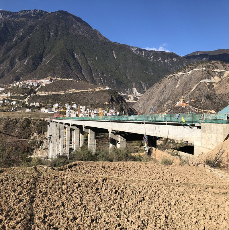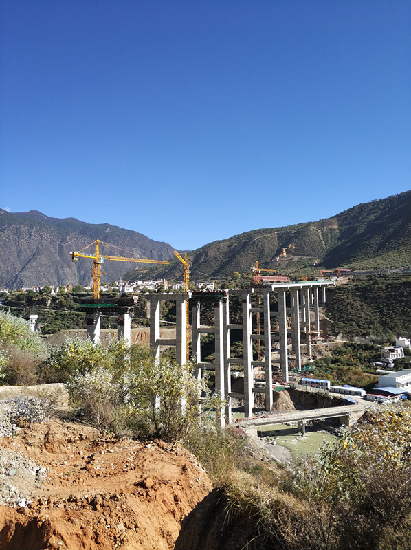 香巴拉大桥是桑然路改建工程的主要控制性工程,全长489米,宽23米,上部结构采用12*40米预应力简支T梁,下部结构采用双柱式空心薄壁桥墩,最高桥墩有81米高。目前下部结构已全部完工,T梁架设完成8跨,计划12月上旬完成桥梁主体工程架设,力争年前实现通车目标。