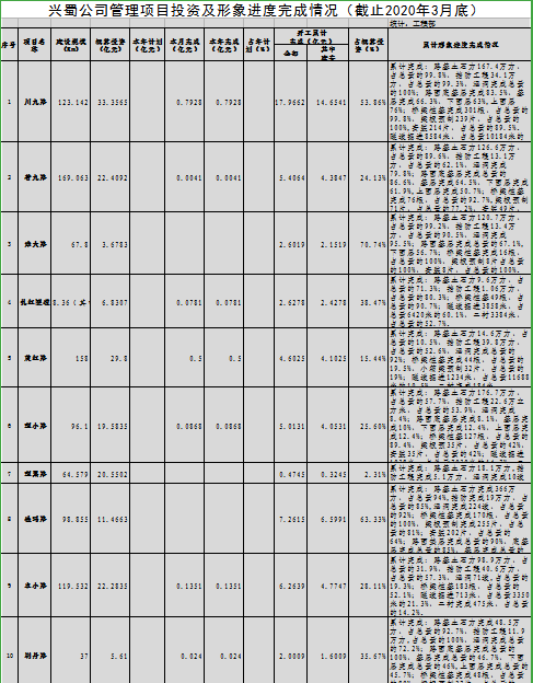 公司管理项目投资及形象进度完成情况(截至2020年3月底)