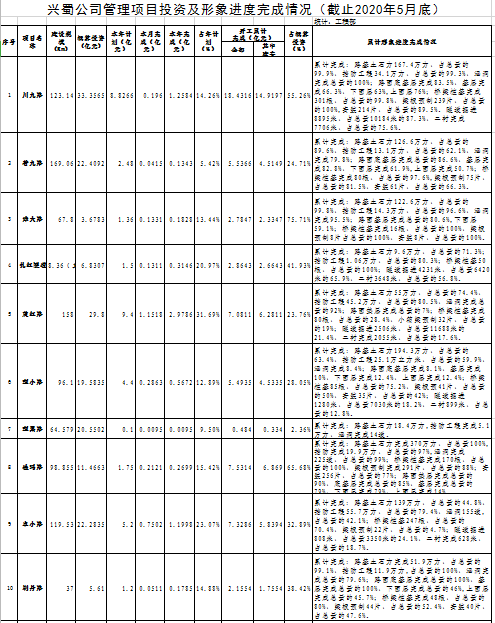 兴蜀公司管理项目投资及形象进度完成情况(截至2020年5月底)