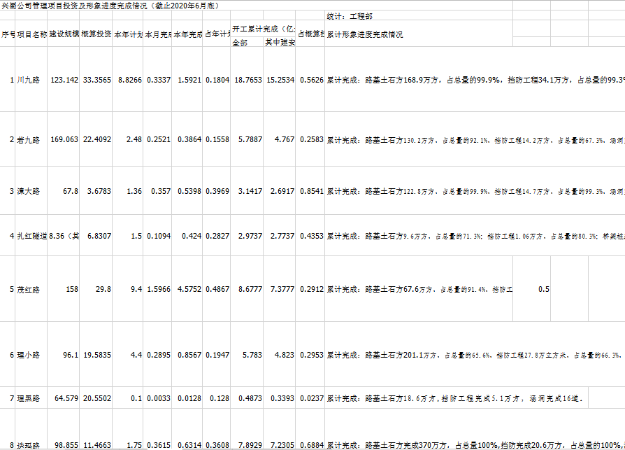 兴蜀公司管理项目投资及形象进度完成情况(截至2020年6月底)