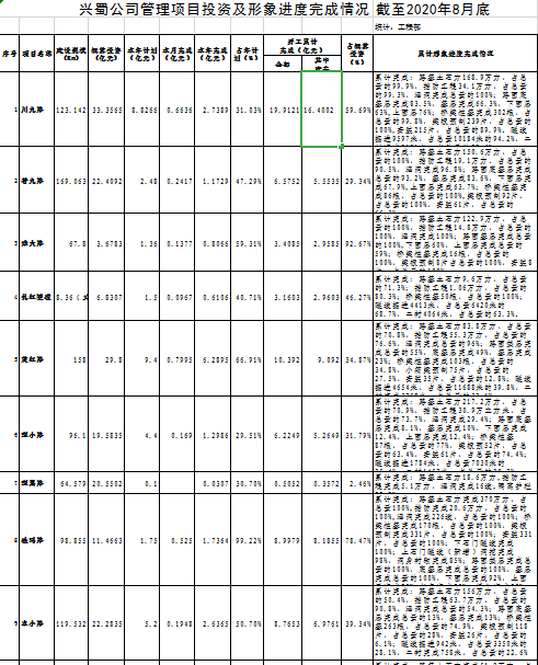 兴蜀公司管理项目投资及形象进度完成情况(截至2020年8月底)