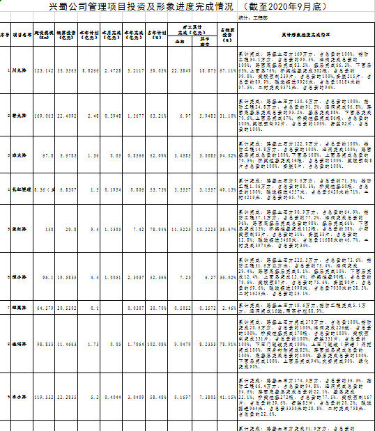 兴蜀公司管理项目投资及形象进度完成情况(截至2020年9月底)