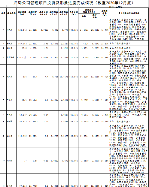 兴蜀公司管理项目投资及形象进度完成情况(截至2020年12月底)