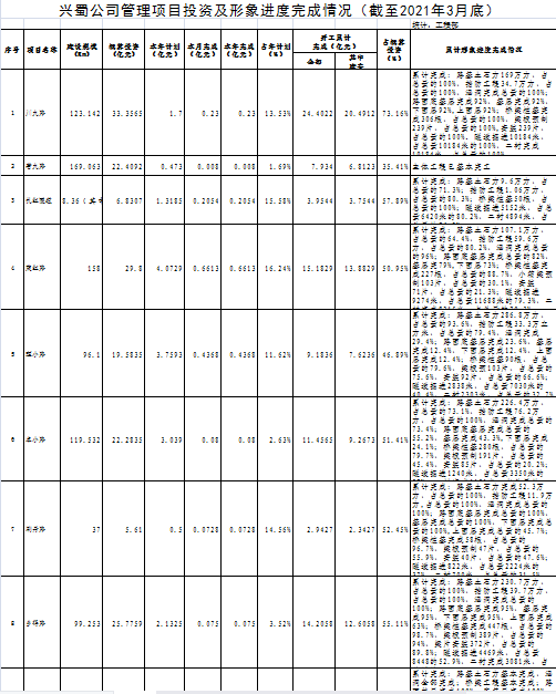 兴蜀公司管理项目投资及形象进度完成情况(截至2021年3月底)