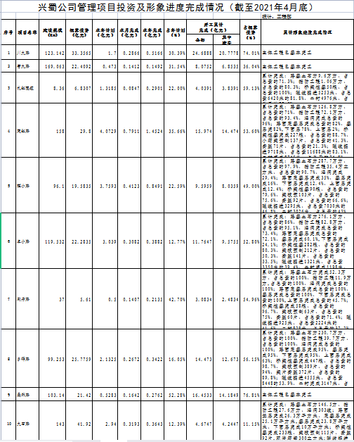兴蜀公司管理项目投资及形象进度完成情况(截至2021年4月底)