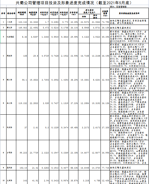 兴蜀公司管理项目投资及形象进度完成情况(截至2021年5月底)