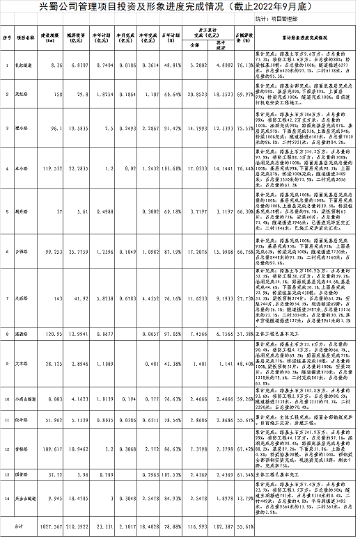 兴蜀公司管理项目投资及形象进度完成情况(截止2022年9月底)