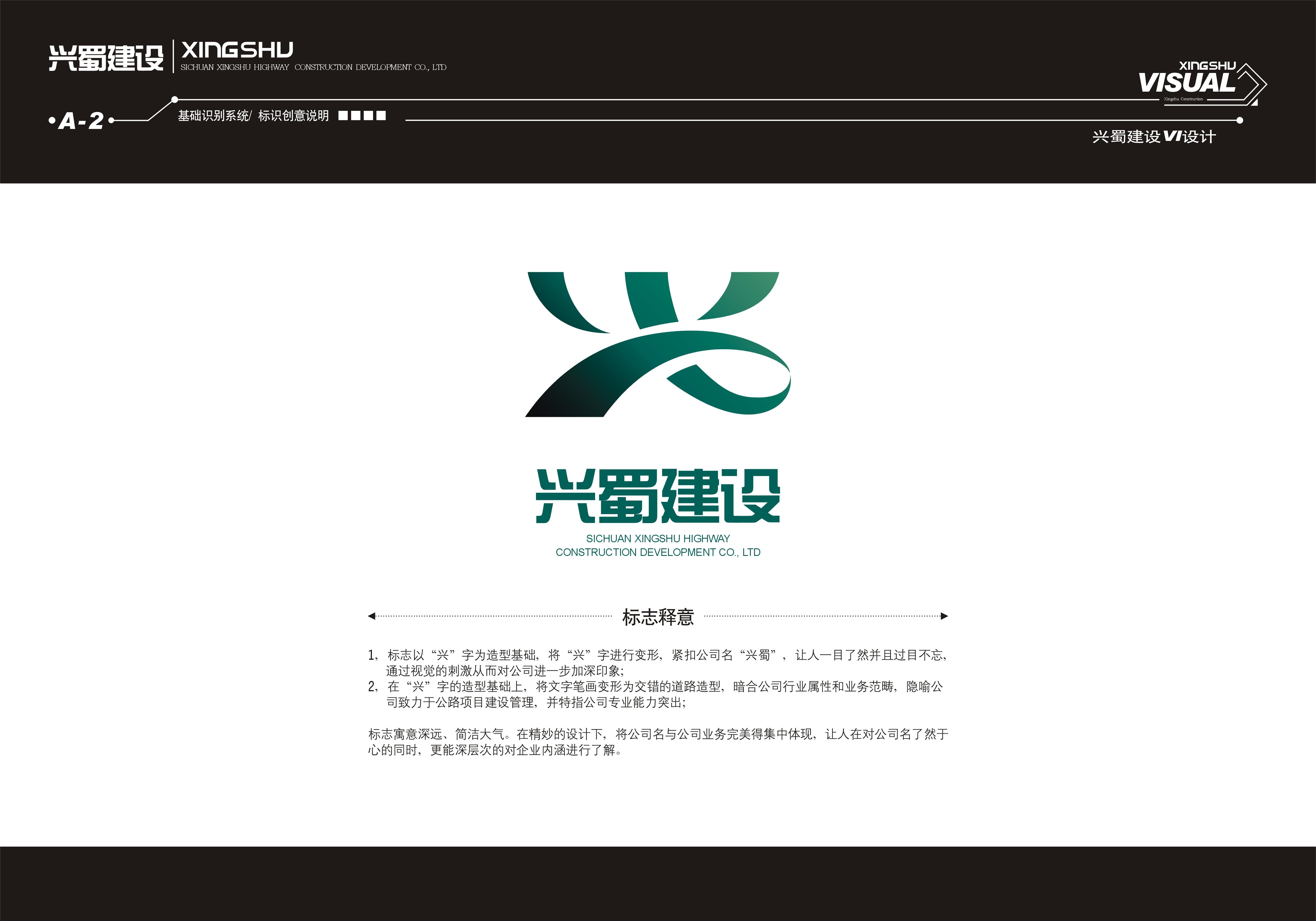 1、 标志以“兴”字为造型基础,将“兴”字进行变形,紧扣公司名“兴蜀”,让人一目了然并且过目不忘,通过视觉的刺激从而对公司进一步加深印象; 2、 在“兴”字的造型基础上,将文字笔画变形为交错的道路造型,暗合公司行业属性和业务范畴,隐喻公司致力于公路项目建设管理,并特旨公司专业能力突出。
