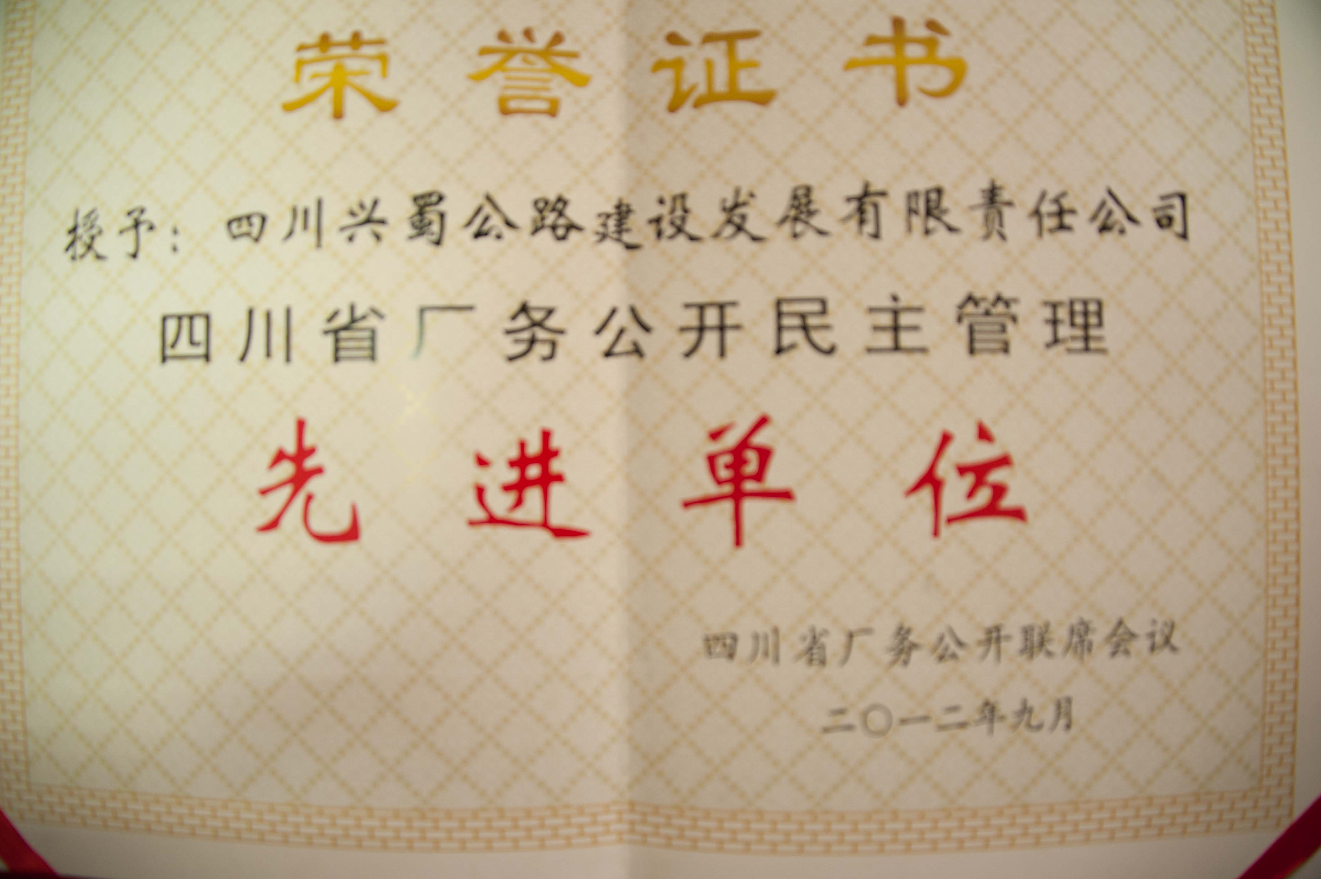 公司日前荣获“四川省厂务公开民主管理先进单位”荣誉称号。