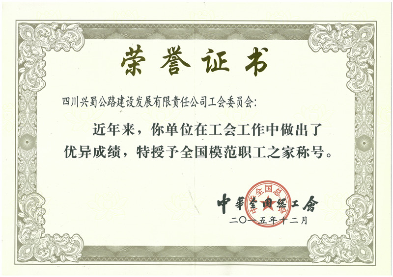 在2015年度中华全国总工会开展的全国模范职工之家评选表彰活动中,兴蜀公司工会委员会被授予“全国模范职工之家”荣誉称号,这是全国工会系统表彰先进职工之家的最高荣誉。获得此项荣誉,既是对公司工会坚持不懈抓职工之家建设的充分肯定,也是公司各级领导、全体工会会员高度重视、认真开展职工之家建设的成果。